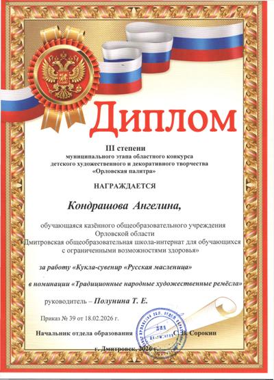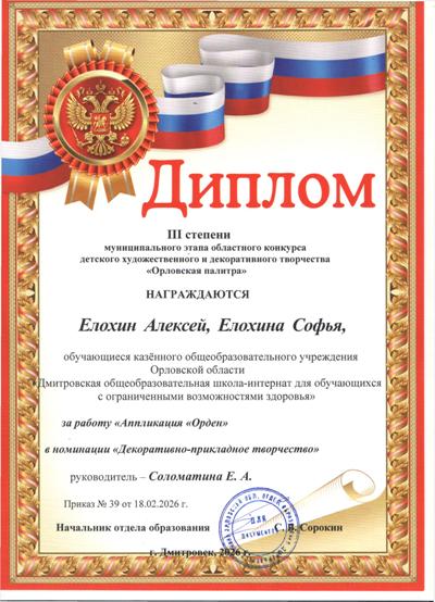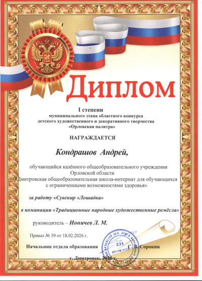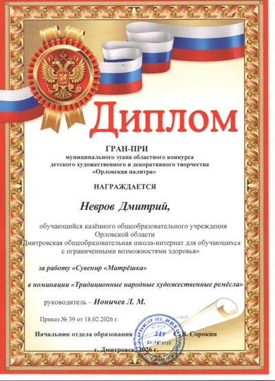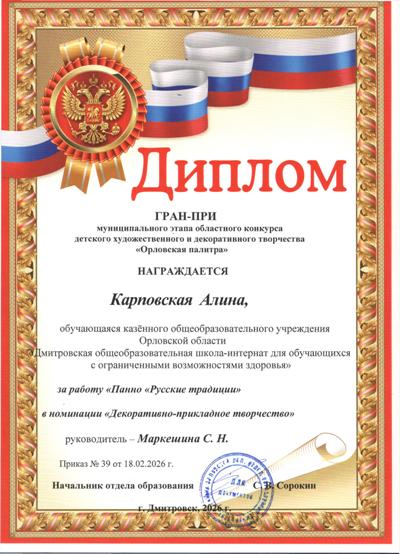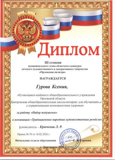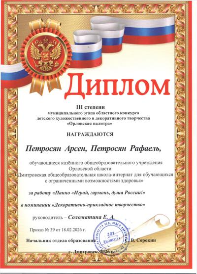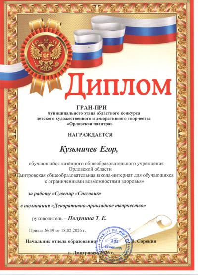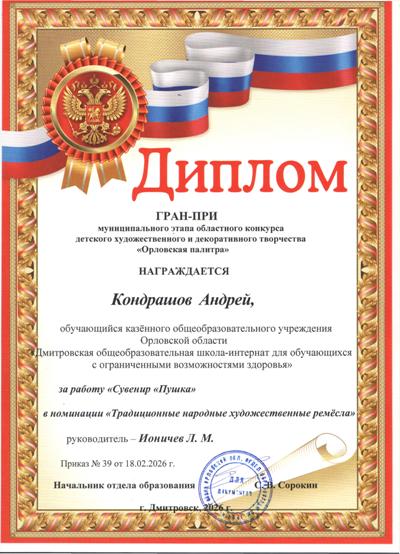 Дипломы за участие в областном конкурсе-выставке детского художественного и декоративного творчества "Орловская палитра"