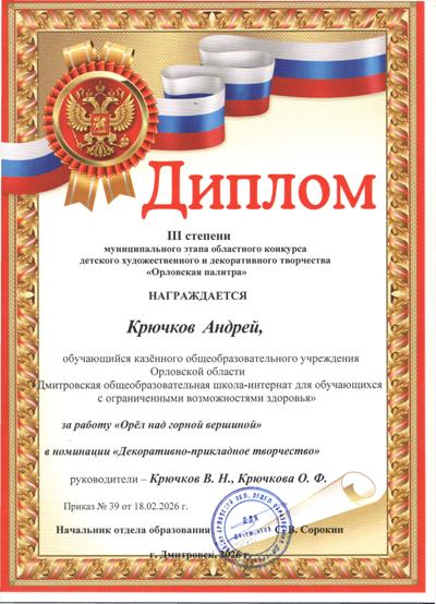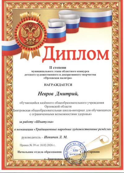 18 февраля 2017 года в целях пропаганды традиций народного творчества Орловского края, сохранения и приумножения культурно-исторического наследия России, выявления и поощрения талантливых детей, проходил районный конкурс- выставка художественного, декоративно-прикладного и технического творчества "Орловская палитра". Воспитанники школы-интерната под руководством педагогов школы приняли активное участие. Конкурс-выставка состоялся в МБОУ «СОШ №1 г. Дмитровска», проходил по номинациям: