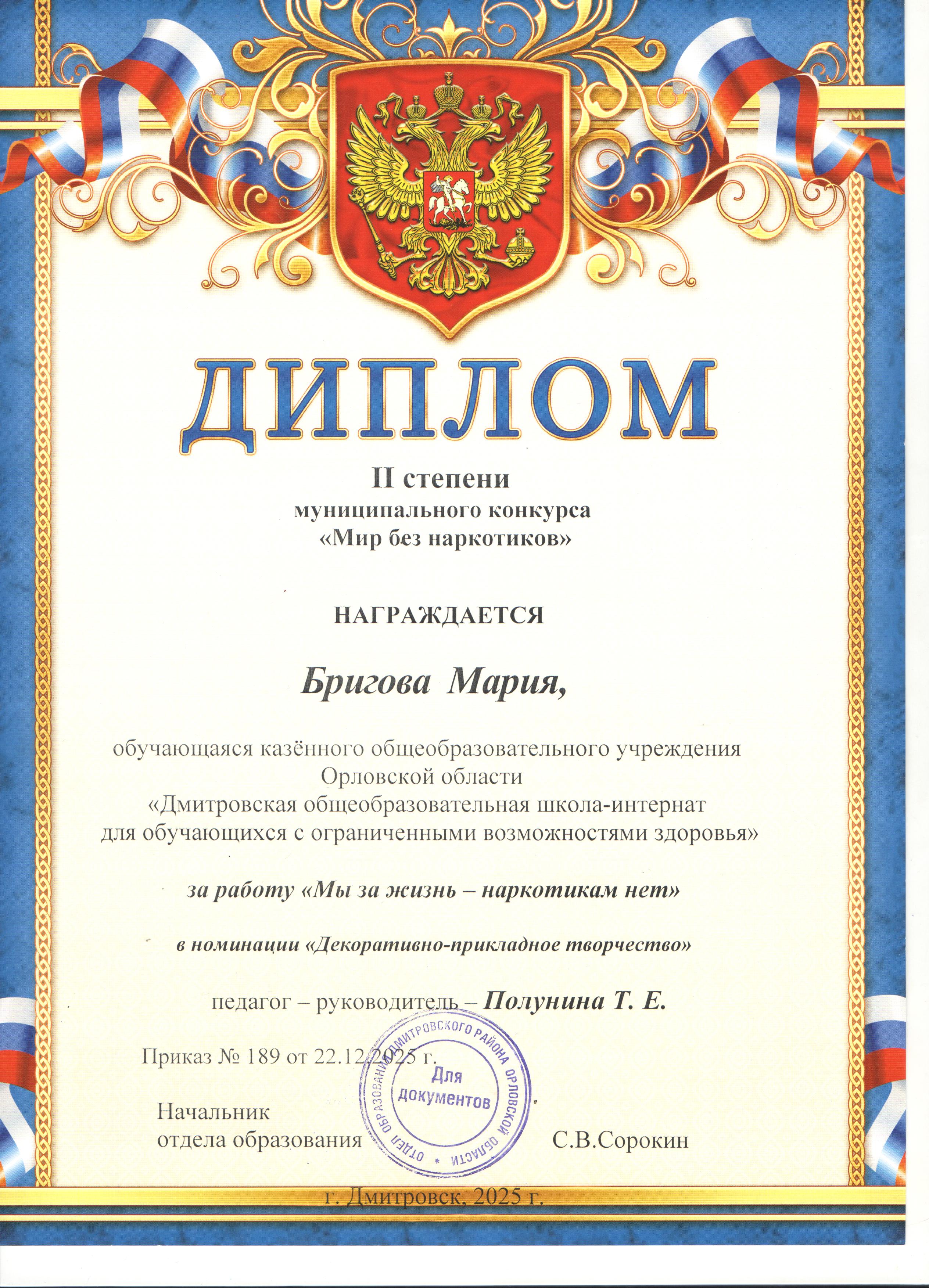 · Почетной грамотой Дмитровского районного отдела образования награждён Свиридов Даниил, обучающийся 10 класса, прочитавший прозу И. С. Тургенева «Христос» и занявший 1 место; руководитель Архарова Н.И.