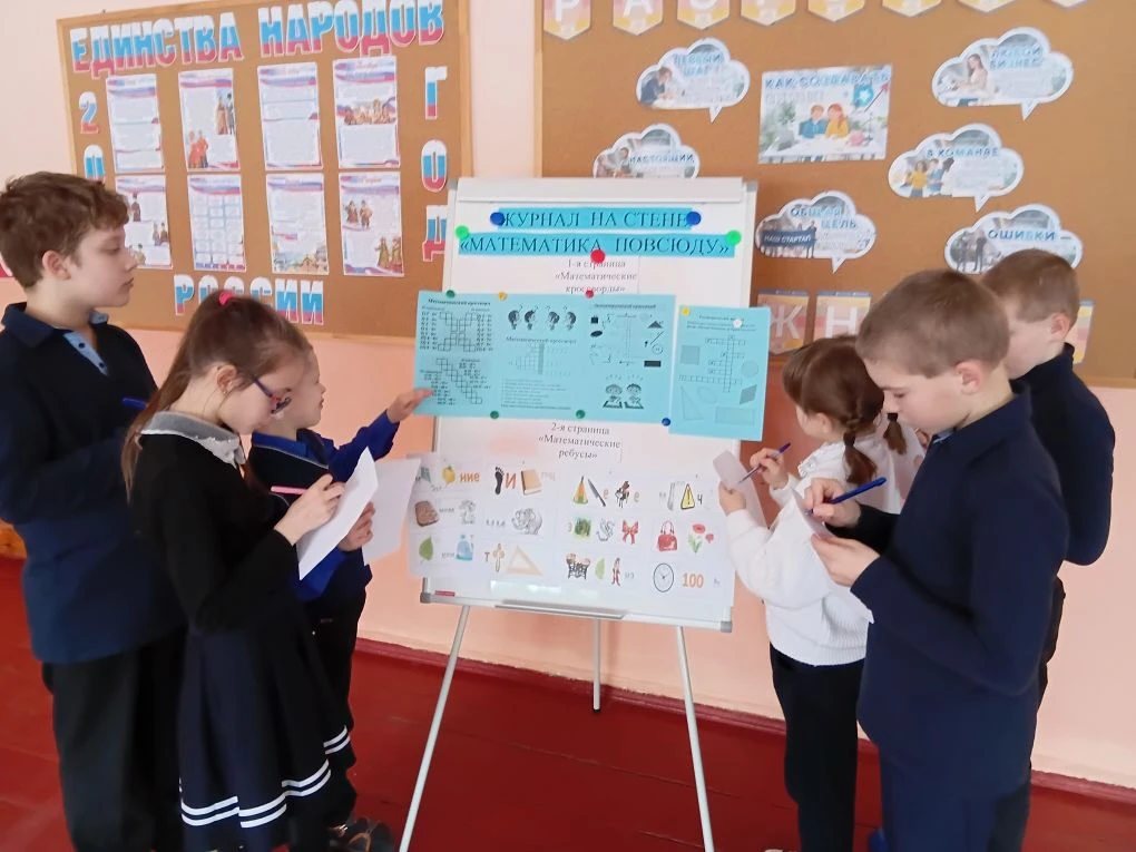Неделя математики в Дмитровской школе-интернате началась с увлекательного мероприятия 🎉📚— работы журнала на стене под названием «Математика повсюду». На первых страницах учителя разместили интересные задания для ребят в виде математических кроссвордов 🧩 и ребусов 😃. Каждую перемену в фойе школы собираются школьники 👫👭 и с большим интересом разгадывают предложенные головоломки, вместе обсуждают решения и правильные ответы, что создает дружелюбную ❤️ и творческую ✨ атмосферу в школе.