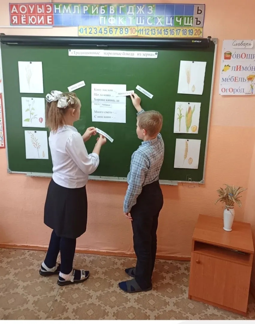 Занятие включало интересные игры, способствующие лучшему усвоению материала. Учащиеся играли в игру "Соотнеси название злаков и название крупы", развивая память и внимание. Игра "Собери пословицы про кашу и хлеб" позволила вспомнить традиционные русские поговорки и обогатила речь детей.