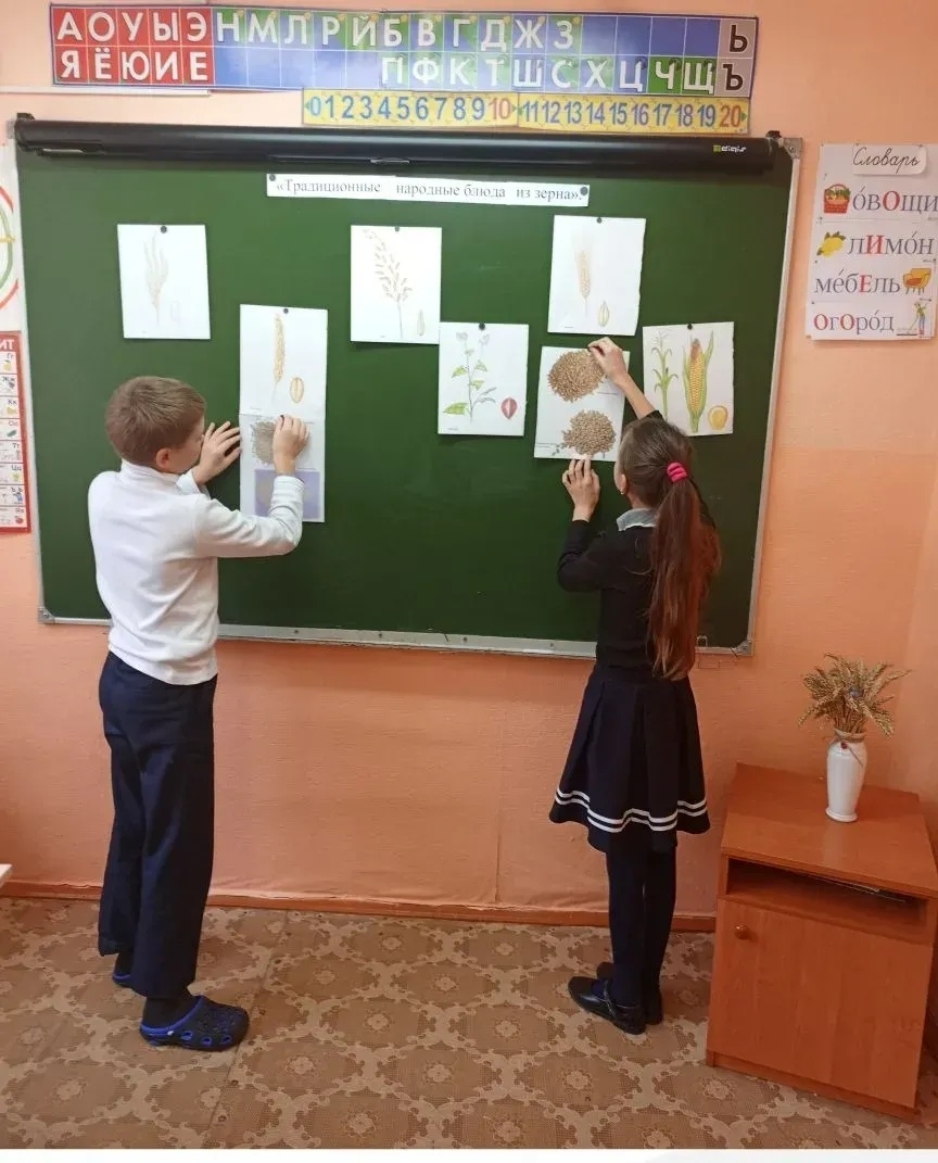 Учитель Землякова Дина Викторовна провела увлекательное занятие для учеников четвертого класса в рамках программы внеурочной деятельности "Разговор о здоровье и правильном питании". Тема занятия была посвящена традиционным народным блюдам из зерна.