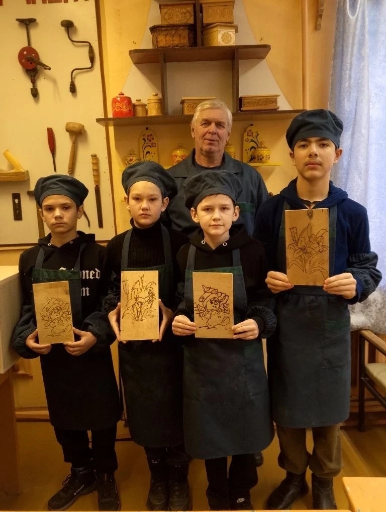 Во время занятия пятиклассникам была предоставлена уникальная возможность проявить творческие способности и закрепить практические навыки в области художественного выжигания рисунков по дереву. Учитель предварительно провел инструктаж по технике безопасности