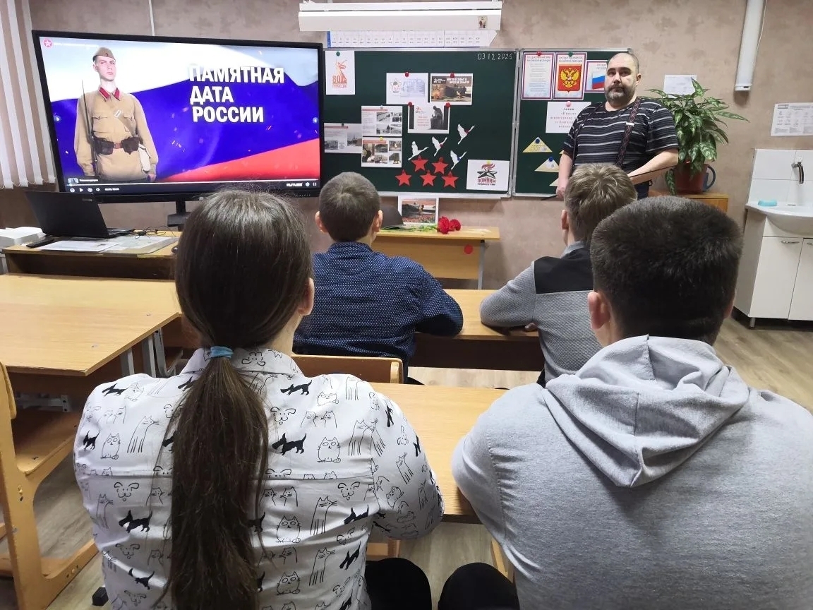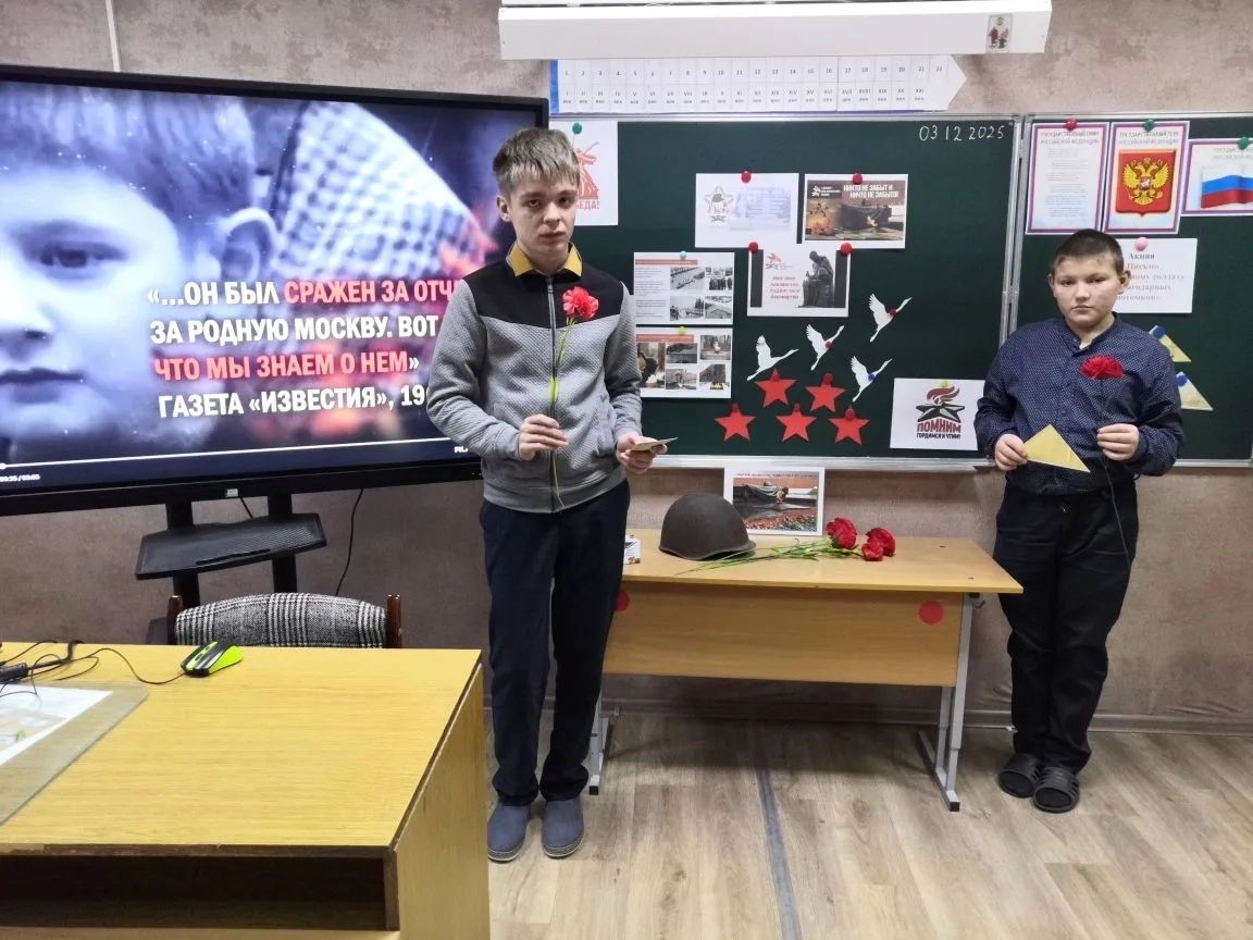 Сегодня, 3 декабря, учитель Хомяков Георгий Вячеславович провел в 7 и 9 классах Час Мужества на тему «3 декабря — День неизвестного солдата».