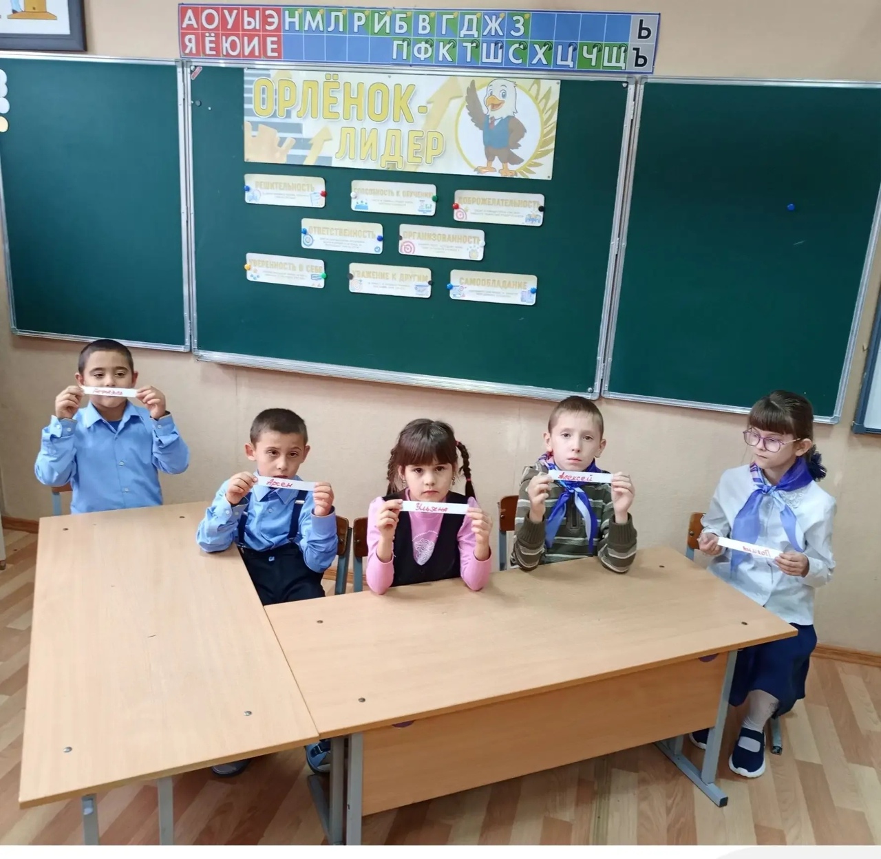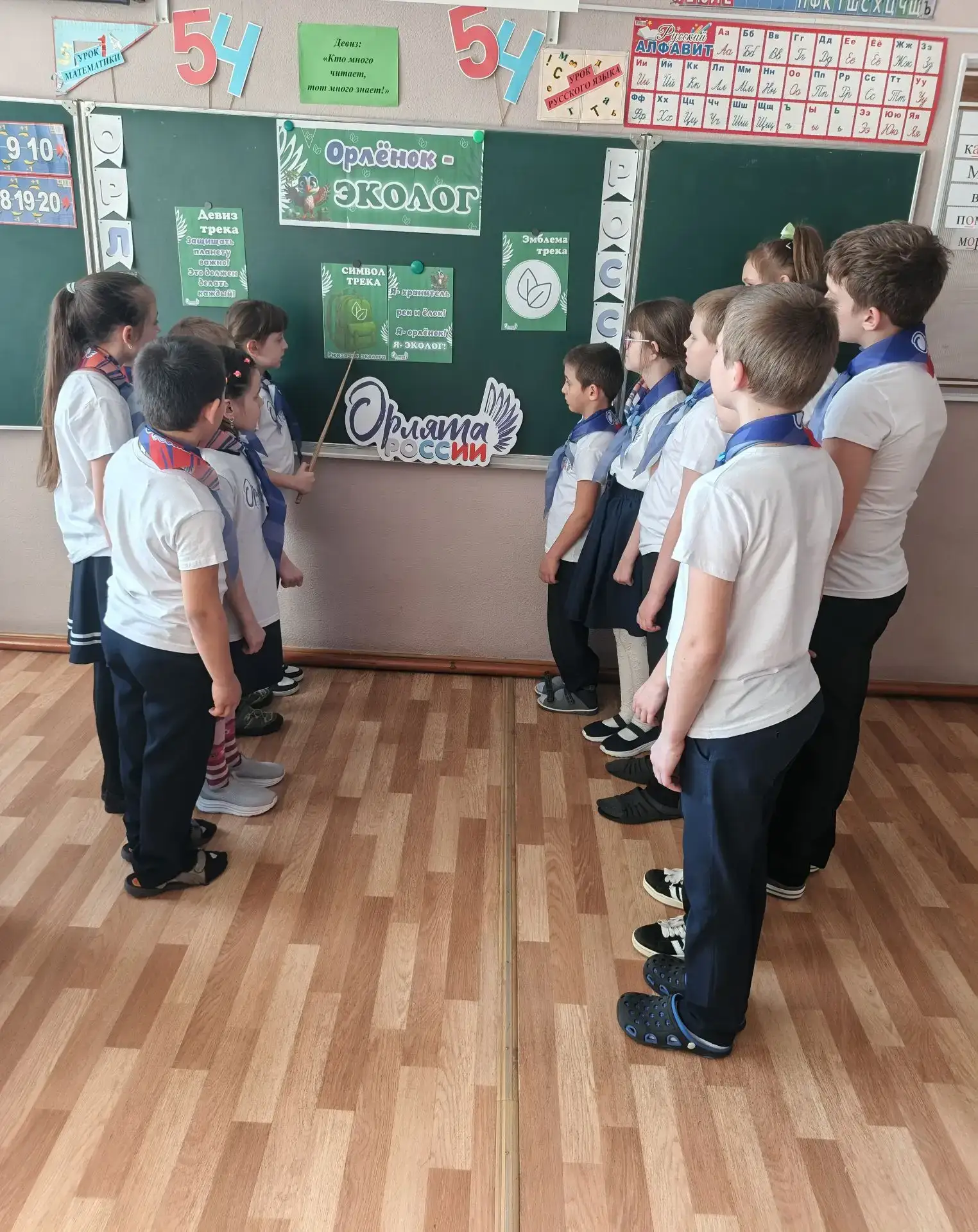 Ребята начальных классов вспомнили названия треков, посмотрели и обсудили фильм о программе "Орленок России". На встречу мальчишки и девчонки пригласили наставника. Старшеклассница поиграла с ребятами в игру " Привет". Орлята узнали значение этого слова.