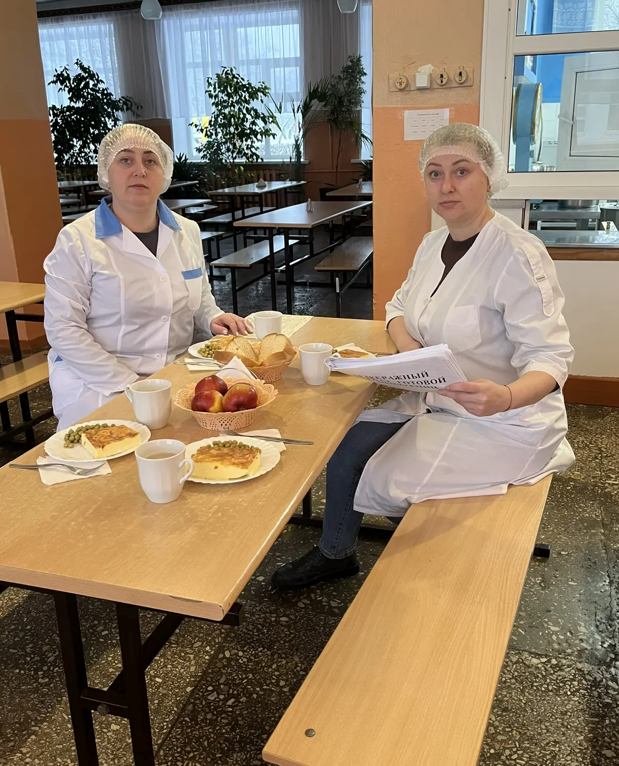 Сотрудники столовой соблюдают гигиенические требования (имеют головной убор и перчатки, спецодежду, обеспечены одноразовыми масками).