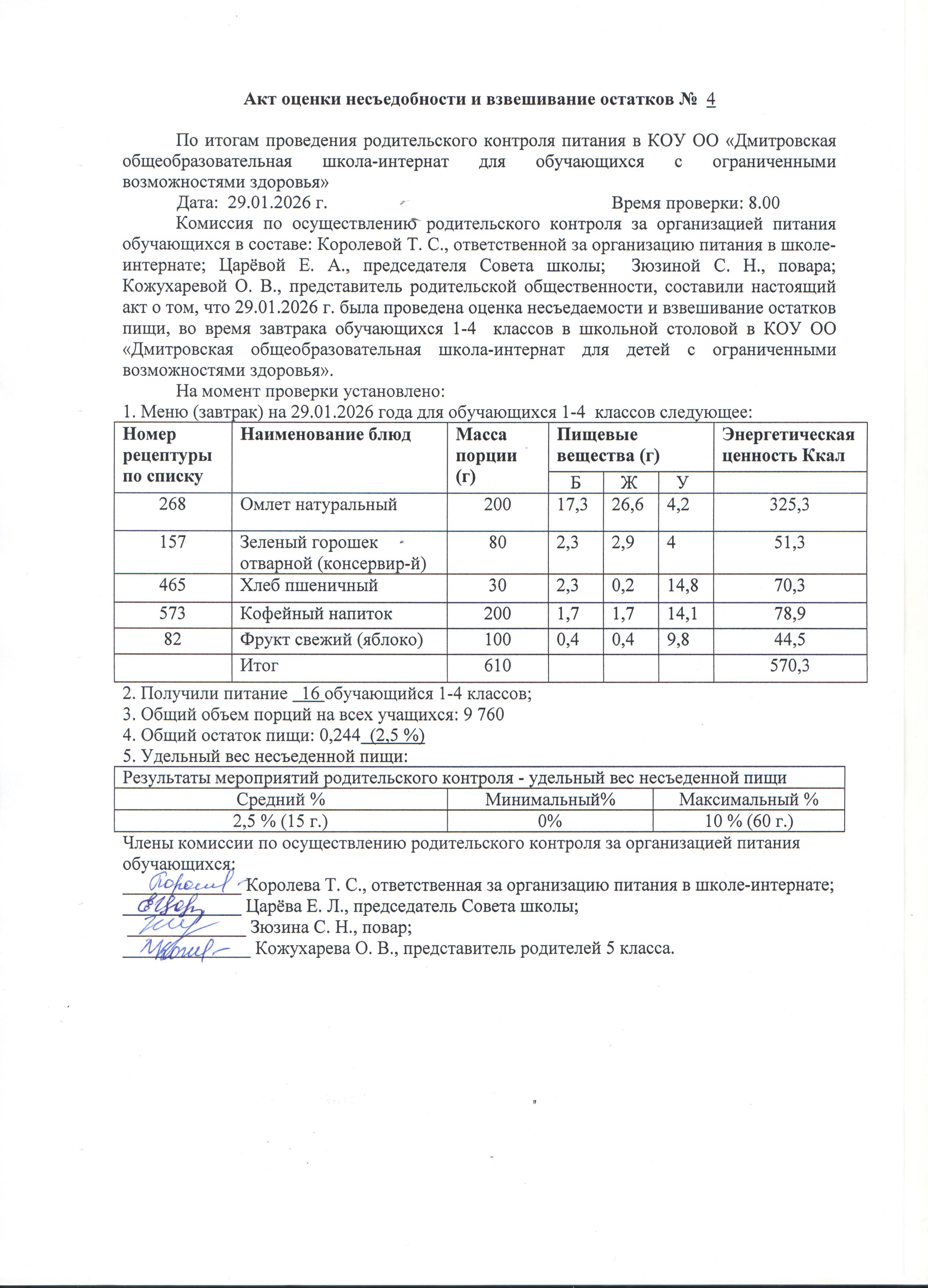 Комиссия в составе: Кировой Л.Д., Царёвой Е.Л., Климовой Т. В., Новиковой Л. И., Крыловой О. С., Николаенко Н. В., осуществляли проверку по следующим показателям: реализация блюд в соответствии с утверждённым меню, температура подачи блюд, соблюдение обучающимися правил личной гигиены, наличие суточных проб, наличие документов по организации питания и правильность их оформления.